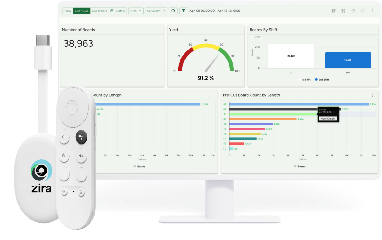 Preconfigured to stream Zira to any TV with a remote, Zira's TV Streamer allows you to cast live feeds from Zira dashboards onto large screens for instant insights into production processes.
